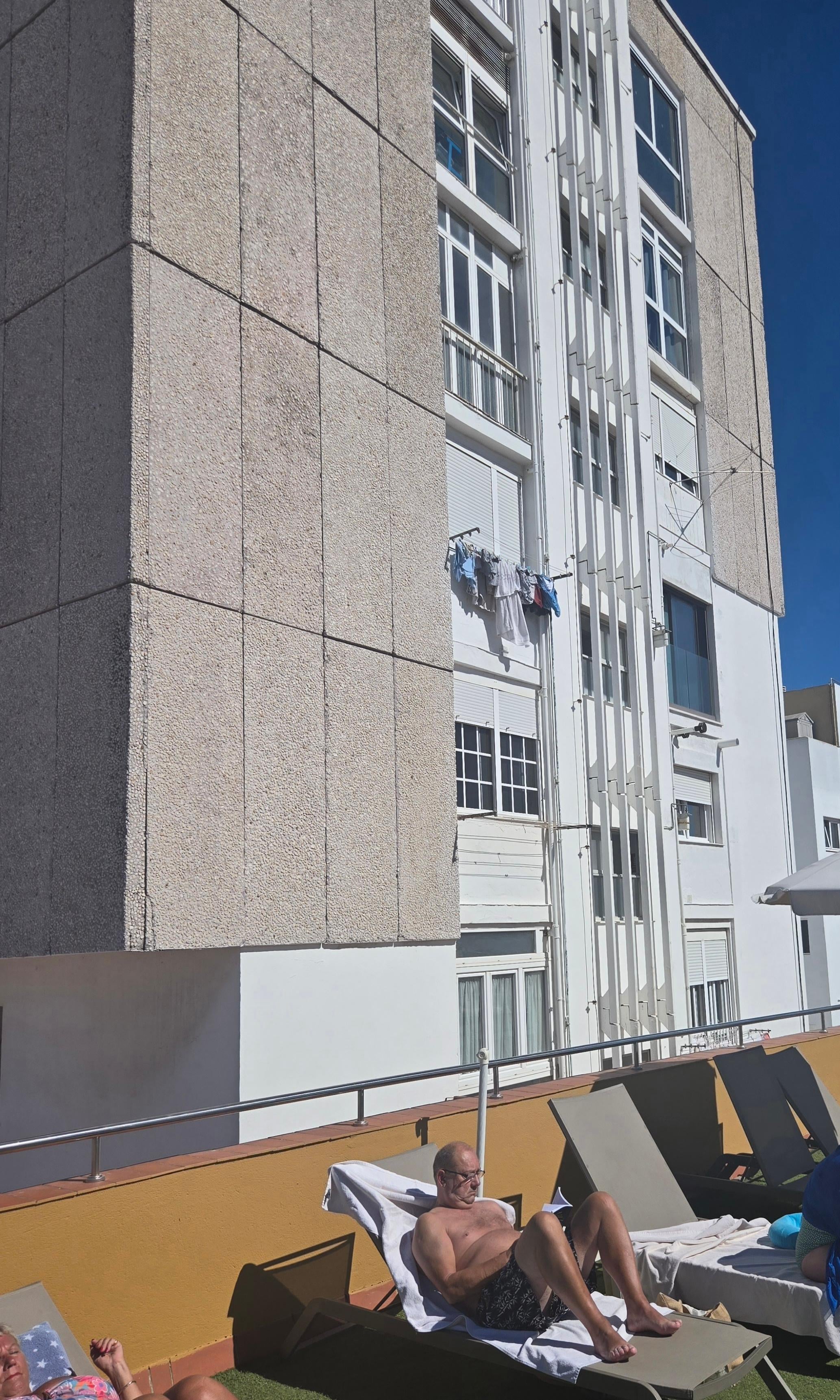 You can't sit next to the pool (there's no space) and the scrap of roof with sunbeds gives views of next doors washing